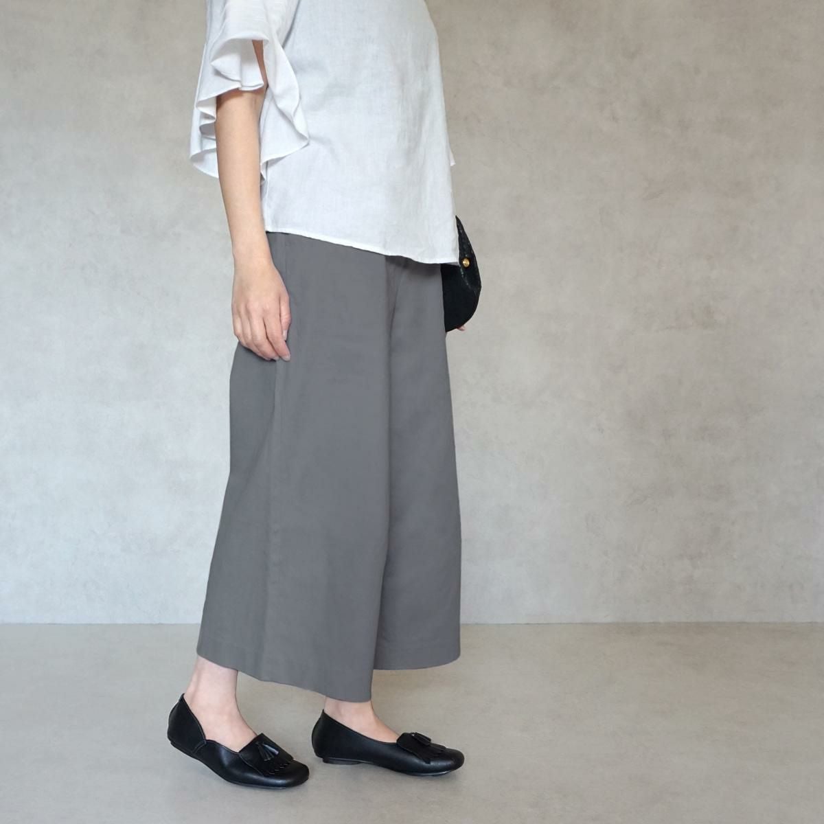 地味に見えがちな無地コーデも、足元にポイントがあると垢抜けた印象に。
