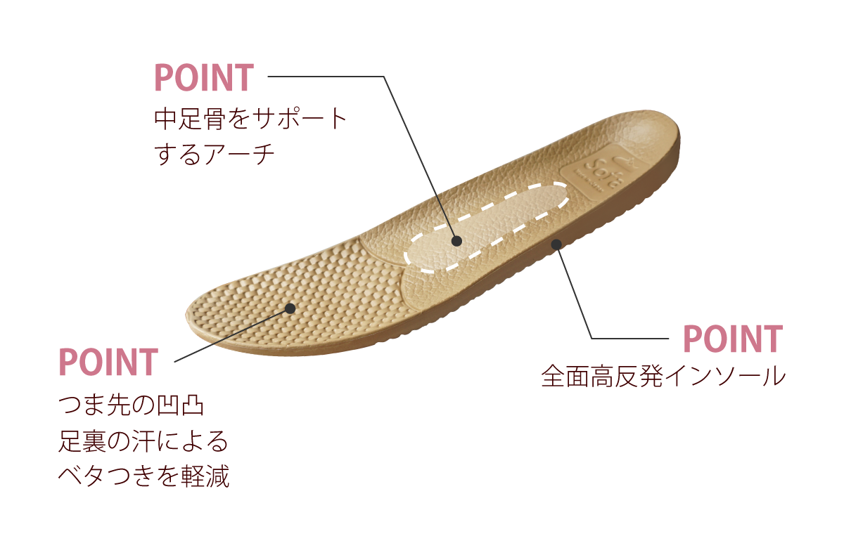 大人気の sofa シリーズに使われているオリジナル「 高反発 」インソール。「 低反発 」では戻りが遅いため、1歩づつの衝撃を受け止める力がとても少なくなります。また、指の隙間にもフィットしてしまうことから、ムレやすく足の健康にも良くありません。